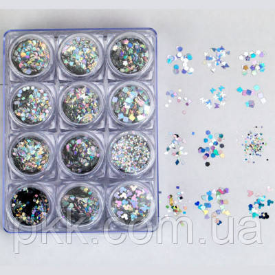 Декор для нігтів Christian мерехтливі золотисті фігури 12 форм в упаковці 12 штук GC-28